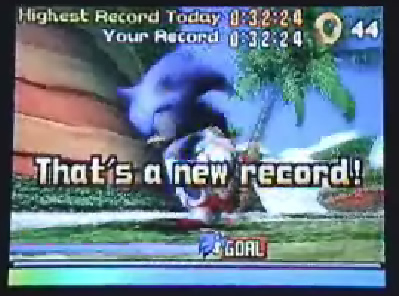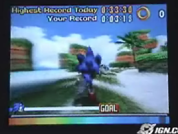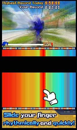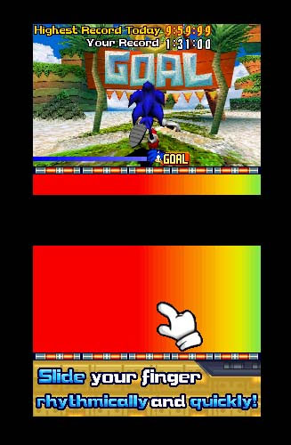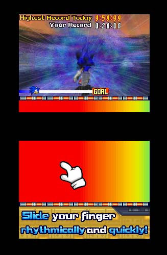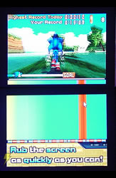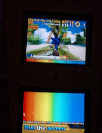 Sonic DS was a demo presented at E3 to show the capabilities of the Nintendo DS. The game consisted of rubbing your finger on the second screen in rhythm with the colours (or something like that) to make Sonic run faster. Below are a few sneaky pictures of the game.